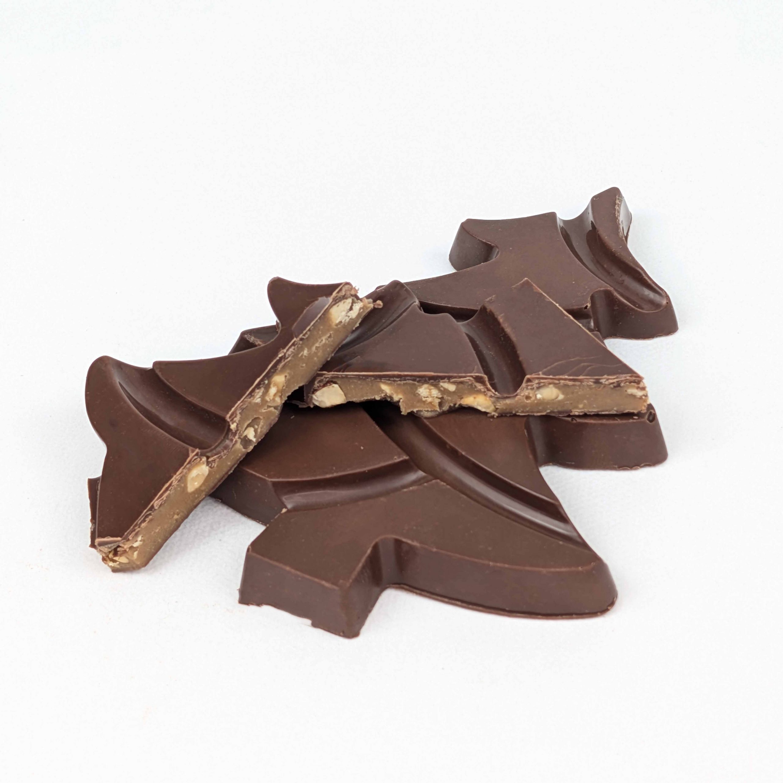 Le praliné au miel de sapin qui garnit notre sapin moulé est préparé avec des noisettes soigneusement enrobées de miel et d’éclats de noisette. Le miel de sapin, plus rare et précieux, apporte des notes résineuses et légèrement épicées qui enrichissent le chocolat et ajoutent une dimension chaleureuse et réconfortante à cette création festive.